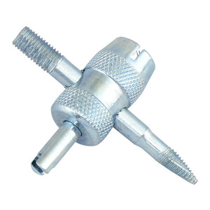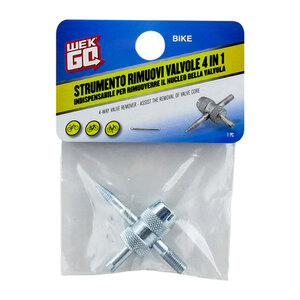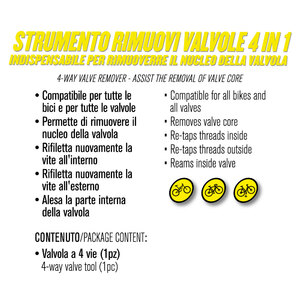 Strumento rimuovi valvole 4 in 1. Indispensabile per rimuovere il nucleo della valvola. Compatibile per tutte le bici e per tutte le valvole. Permette di rimuovere il nucleo della valvola. Rifiletta nuovamente la vite all'interno. Rifiletta nuovamente la vite all'esterno