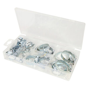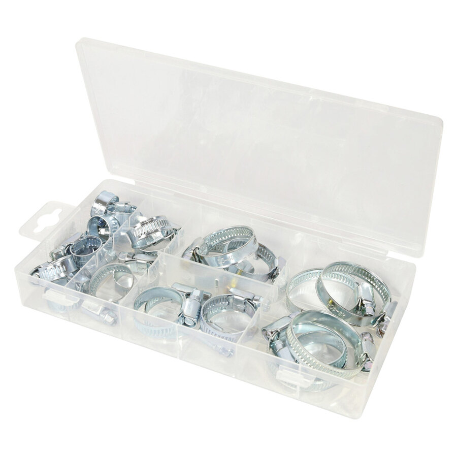 Set fascette metalliche. Consentono di serrare tubi in gomma o PVC con un diam. da 16mm a 40mm. Sono robuste e si adattano perfettamente al tubi flessibili. 8x diam16mm - 6x diam22mm - 4x diam25mm - 2x diam.28mm - 2x diam.35mm - 4x diam.40mm. Nessun rischio di danneggiare gomma o pvc
