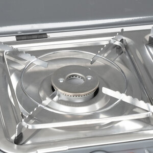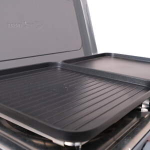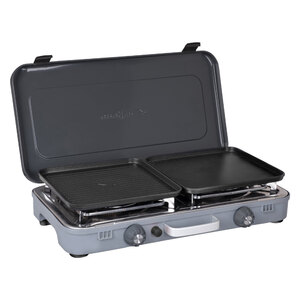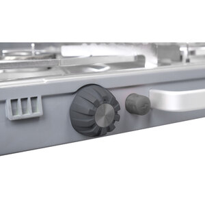 Fornello a gas. Realizzato con un'elegante superficie di cottura in acciaio inox, questo fornello a 2 fuochi combina funzionalità e stile. Grazie all'accensione piezoelettrica, l'accensione del fornello è semplice e immediata. Progettato con un comodo coperchio e una maniglia per un trasporto agevole, è perfetto per le avventure all'aperto o come riserva affidabile anche a casa. Il Devil Kookmaster GP viene fornito con una piastra di cottura liscia e una piastra di cottura rigata. 2,4kW x 2. Peso 5,3kg 30mbar