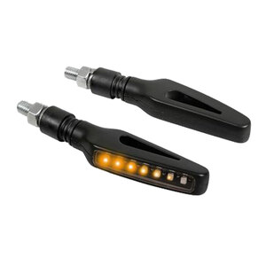 Indicatori di direzione a led - 12V LED. Omologazione E. Lente bianca, luce arancio. Cavi con connettori rapidi. Sporgenza con snodo gommato antirottura. Alta resistenza alle vibrazioni. Lunghezza freccia 91mm