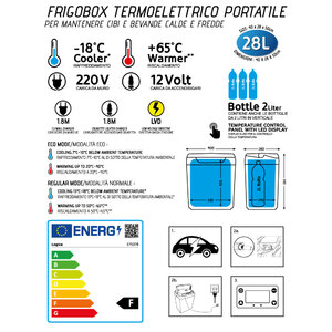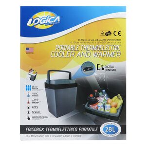Frigobox termoelettrico portatile per mantenere cibi e bevande calde e fredde. Raffreddamento Eco mode F: 7-10°C al di sotto della temperatura ambientale. Raffreddamento Regular mode: 13-18°C al di sotto della temperatura ambientale. Riscaldamento Eco mode F: 20-40°C. Riscaldamento Regular mode: 50-65°C. Display a led per il controllo della temperatura. Può contenere anche bottiglie da 2lt in verticale. Certificato ERP ed ecologico. Scomparto cavi integrato nel coperchio. Maniglia sollevabile con funzione di blocco automatico. Ideale per viaggiare, per attività all'aperto e da usare come mini frigo extra per la casa. Include alimentatore da presa 12V, alimentatore da parete EU da 220V-240V AC. Dimensioni interne: 33x24x40,5cm. Dimensioni esterne: 40x28x50cm