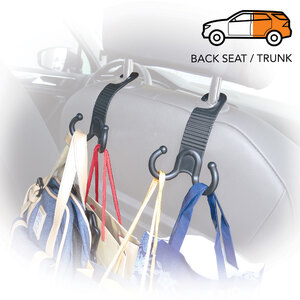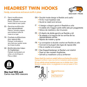 Ganci multifunzione per poggiatesta. Pratico, comodo e sicuro per tenere tutte le cose a posto. Il design a doppio gancio è flessibile e utile. Si adatta alla maggior parte delle aste per poggiatesta. Veloce da installare e da rimuovere. Carico max 5kg ciascuno