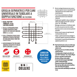Griglia separatrice per cani universale da auto in tubolare a doppia funzione in 3 sezioni. Soluzione perfetta per offrire un'esperienza di viaggio piacevole al guidatore, ai passeggeri e al vostro animale domestico. Barriera con doppia funzione per essere usata sia per tenere separato il carico e/o come divisione del sedile posteriore per tenere comodo il vostro animale domestico. Completamente regolabile in altezza e larghezza per adattarsi alla maggior parte dei SUV/Auto a due volumi/Van/Statio Wagon. Permette una visione chiara fuori dal lunotto posteriore. Montaggio ed installazione rapidi con tubi che si montano a pressione. Senza la necessità di praticare fori, buchi o utilizzare strumenti. Tamponi di protezione in gomma per proteggere il rivestimento, tappetini e prevenire gli scivolamenti. Realizzata con tubi in acciaio verniciato a polvere resistenti ma leggeri. Facile da riporre in quanto di piccole dimensioni e pieghevole quando non in uso