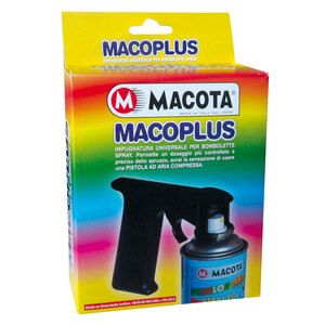 Impugnatura universale per bombolette spray. Permette un dosaggio più controllato e preciso dello spruzzo. Spruzzare con Macoplus da la sensazione di una pistola ad aria compressa