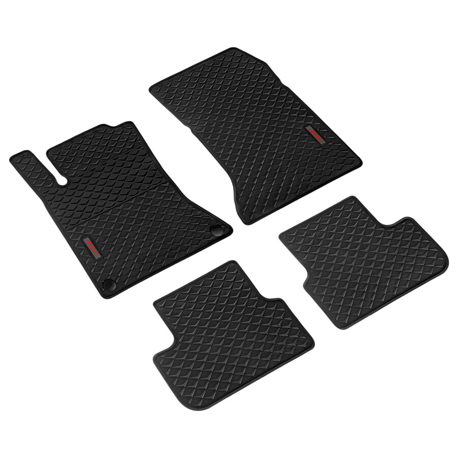Set tappeti su misura in eco gomma. Eco gomma di alta qualità e lunga durata. 100% riciclabile, atossica, inodore. Materiale conforme alle normative Reach reg.1907/2006. Bordatura a rilievo maggiorato. Possono essere utilizzati anche in condizioni estreme con forte presenza di acqua, fango, sporcizia e neve. Retro antiscivolo. Facili da pulire