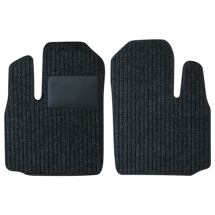 Coppia tappeti realizzati in resistente moquette particolarmente adatta all'impiego sui veicoli commerciali. Colore grigio a righe nere