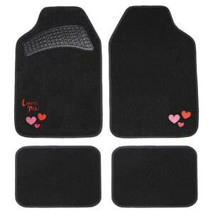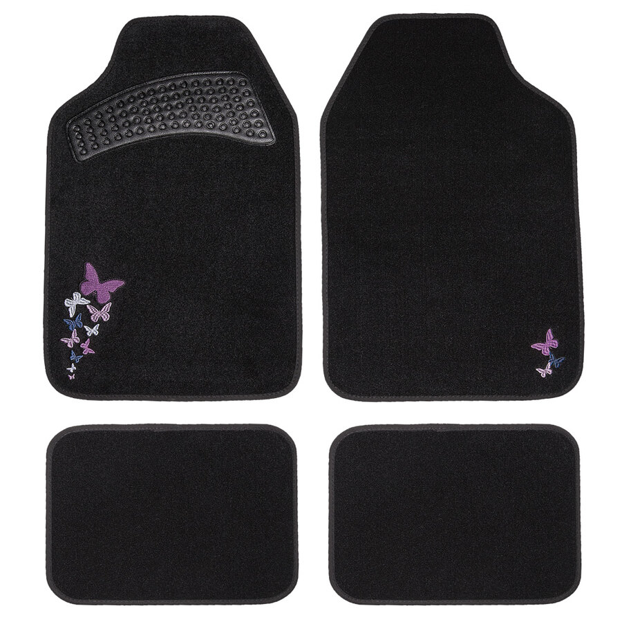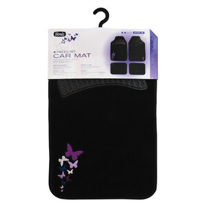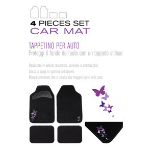 Proteggi la tua auto con un tappetino stiloso! Tappeti auto universali realizzati in velluto resistente, durevole e antimacchia. Dorso a spiga in gomma antiscivolo. Battitacco in gomma. Misura universale che si adatta alla maggior parte dei modelli di auto. Misure: tappeti anteriori 65x42,7cm, tappetini posteriori 28x41,5cm