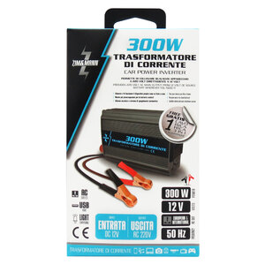 Trasformatore di corrente Permette di colllegare qualsiasi apparecchio a 220V direttamente a 12V. Alimenta e fa funzionare il dispositivo proprio come se foste a casa. Niente più preoccupazioni per la batteria scarica! Allarme acustico e sistema di spegnimento automatico. Interruttore di circuito On/Off per un funzionamento sicuro. Con porta USB (per ricaricare Smartphone/Tablet) e presa di uscita AC. Ventola di raffreddamento integrata. Con pinze di collegamento alla batteria. Frequenza 50Hz. Potenza continua: 300W. Potenza di picco: 600W. Porta di ricarica USB: DC 5V. Entrata: DC12V Uscita: AC 220V. AC out: European e International