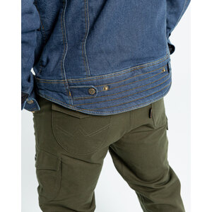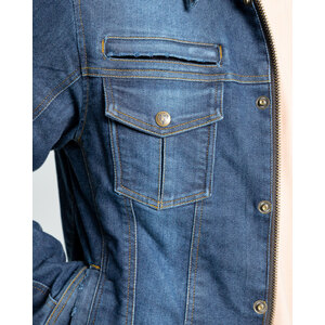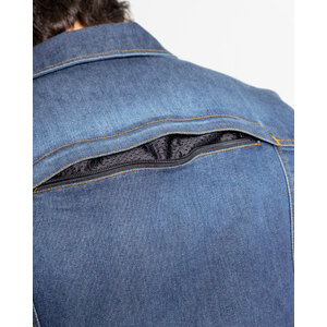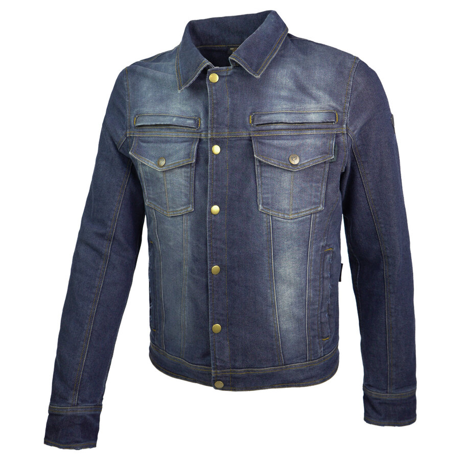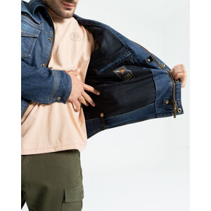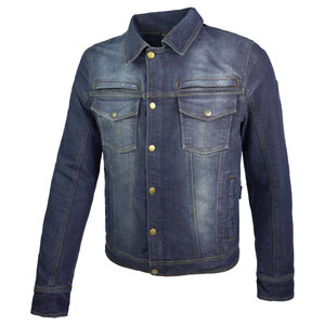 Giacca da uomo, da moto, in denim con prese d'aria. Chiusura con cerniera YKK e bottoni. Realizzato in tessuto denim di cotone. Tecnologia a filato spalmato. Include quattro tasche esterne. Regolabile ai polsi e in vita. Aperture di ventilazione sul davanti e sul retro. Predisposizione per la fodera antivento (fodera non inclusa). Tasche interne per le protezioni (protezione per la schiena non inclusa). Protezioni removibili "Flexishock" su gomiti e spalle certificate EN1621-1: 2012 CE Livello 2. Prodotto omologato per moto CE EN17092-4: 2020 Livello AA