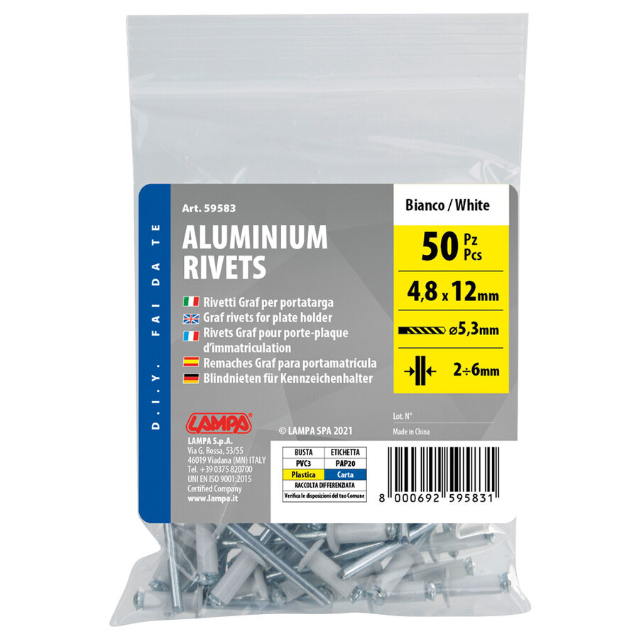 Set 50 rivetti Graf per portatarga. Rivetti in alluminio misura 4,8x12mm. Foro d'inserimento 5,3mm Spessore tenuta 2-6 mm