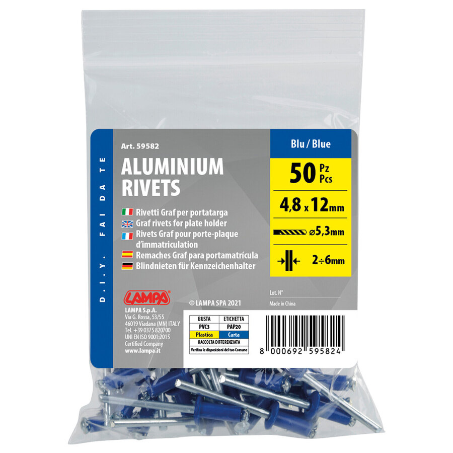 Set 50 rivetti Graf per portatarga. Rivetti in alluminio misura 4,8x12mm. Foro d'inserimento 5,3mm Spessore tenuta 2-6 mm