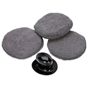 Impugnatura con set 3 cuscinetti intercambiabili in microfibra. Cuscinetti in morbidissima microfibra. Perfetti per pulire, applicare la cera e lucidare. L'impugnatura in plastica si aggrappa al cuscinetto e consente di lavorare senza sporcarsi le mani e con minore sforzo. Diam. 100mm. Composizione: microfibra 80% poliestere + 20% poliammide. Imbottitura spugna: 100% poliestere. Impugnatura: PP