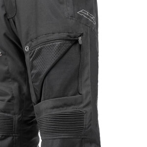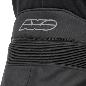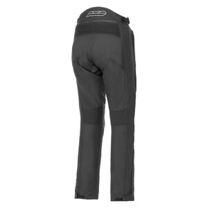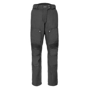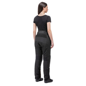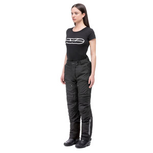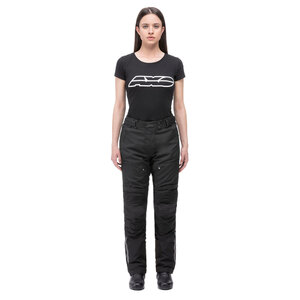 Pantalone in tessuto da donna, 4 stagioni. Interno removibile impermeabile e antivento in poliestere termo nastrato. Interno imbottito e foderato in tessuto trapuntato. Esterno in tessuto armaturato con rinforzi in pelle su interno gamba e dettaglio in materiale antiscivolo su fondo schiena. Apertura anteriore con zip, bottone, gancio e costruzione impermeabile. 2 Tasche su punto vita con chiusura zip. Multi regolazioni su vita e fondo con velcro. Aperture al fondo con zip e velcro. Inserti elastici su punto ginocchio e vita posteriore. Dettagli in materiale stretch su ginocchio posteriore. Ampie aperture di ventilazione su area gambe anteriori. Dettagli riflettenti. Interno foderato in tessuto traspirante.Zip di connessione su punto vita per collegamento giacche AXO. Protezione fianchi opzionale (2072188 per tutte le taglie). Certificato EN17092:2020 Livello Classe A. Protez. EN1621-1 di Livello 1 Type A su ginocchia. Predisp. per protettori bacino EN1621-1 livello 1 Type B