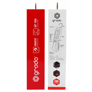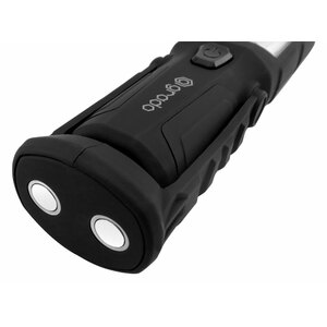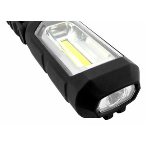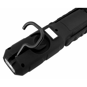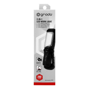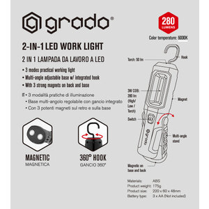 Lampada da lavoro a Led 2 in 1. 3 modalità pratiche di illuminazione. Base multi angolo regolabile con gancio integrato. 3 potenti magneti sul retro e sulla base. 220x60x48cm Funziona con 3 batterie AA (batterie non incluse). 280lm