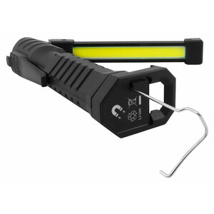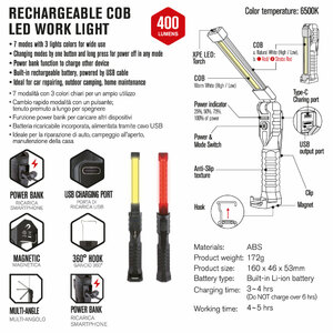 Lampada ricaricabile da lavoro Cob Led. Multi angolo. Ricarica smartphone. 400 lumens. 6500K. 7 modalità con 3 colori chiari per un ampio utilizzo. Cambio rapido da un modalità all'altra con un solo pulsante. Funzione power bank per caricare altri dispositivi. Batteria: ricaricabile al Litio incorporata, alimentata tramite cavo USB. Ideale per la riparazione di auto, campeggio all'aperto, manutenzione della casa. Dimensioni: 160x46x53mm Peso: 172g