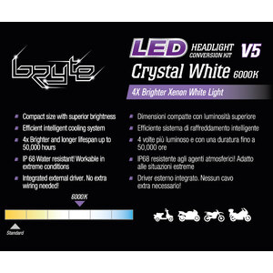 Dimensioni compatte con luminosità superiore. Efficiente sistema di raffreddamento intelligente. 4 volte più luminoso e con una durata fino a 50,000 ore. IP68 resistente agli agenti atmosferici. Adatto alle situazioni estreme. Driver esterno integrato. Nessun cavo extra necessario. Potenza 52W. Lumen 5700lm. Tensione di funzionamento: 12V. Att.ne: alcuni veicoli sono dotati di sistema di controllo CANBUS e l'installazione di lampadine a LED può causare segnali di errore