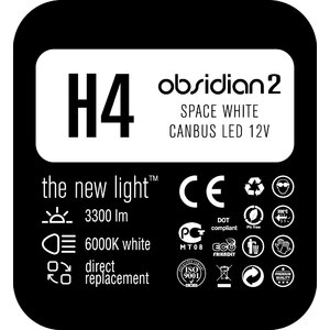 Lampadina H4 H/L speciale a Led Obsidian. Space white Canbus Led 12V. Luminosità 6 volte superiore rispetto alle classiche lampadine. Gradazione white 6000K. Grazie alla resistenza incorporata elimina al 99% il problema dell'accessione della spia lampadine bruciate del computer di bordo o dello sfarfallamento delle luci nelle vetture di ultima generazione. Per alcuni veicoli che hanno il computer di bordo (OBC) potrebbe essere necessario aggiungere una coppia di resistenze di carico al fine di evitare il messaggio di errore visualizzato sul cruscotto