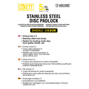 Lucchetto ad arco in acciaio inossidabile. Chiave unica x2. Corpo della serratura in acciaio inossidabile. Perfetto per bloccare freni a disco delle moto, cancelli per porte, tettoie, ecc. Diam. 0,8cm