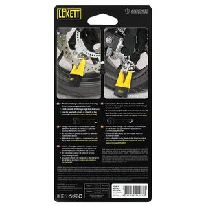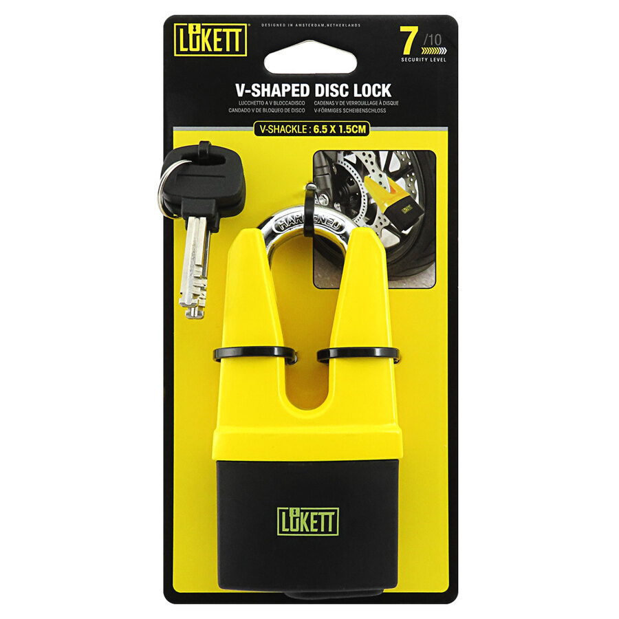 Lucchetto a V, utilizzabile anche come bloccadisco. Design ultra-sicuro: il corpo solido della serratura è dotato di cilindro in speciale acciaio temprato da 13mm. Un lucchetto in grado di offrire un elevato livello di sicurezza. Utilizzabile con catene o direttamente nel disco freno (cavo di promemoria non incluso)