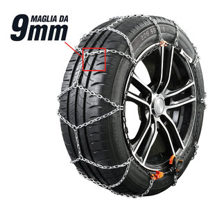 Catena con maglia da 9mm, autotensionante, massimo comfort di guida. Priva di particolari che attraversano il cerchione. Maglia ad ingombro ridotto in acciaio cementato di alta qualità. Att.ne: Le catene vanno sempre montate nelle ruote dell'asse di trazione indicato nel libretto di "Uso e manutenzione" proprio del veicolo. Verificare che le catene siano compatibili con la misura delle gomme dell'asse di trazione. Fare particolare attenzione nei veicoli a trazione integrale o mista, rispettare sempre quanto previsto dalla casa costruttrice.