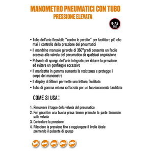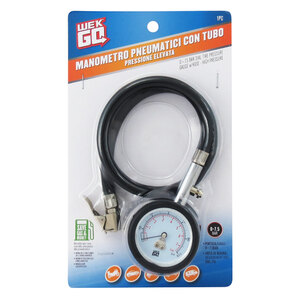 Manometro pneumatici con tubo. Pressione elevata. Range 0-7,5BAR. Tubo dell'aria flessibile "contro le perdite" per facilitare più che mai il controllo della pressione dei pneumatici. Pulsante di spurgo dell'aria integrato per ridurre la pressione ed evitare il gonfiaggio eccessivo. Il manicotto in gomma aumenta la resistenza e protegge il corpo del manometro. Il display da 50mm permette una lettura facilitata. Benefici di una corretta pressione dei pneumatici: minor consumo di carburante, minor usura dei pneumatici, maggior sicurezza! Unità di misura: BAR, PSi
