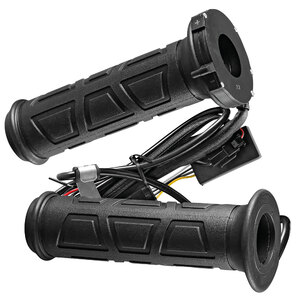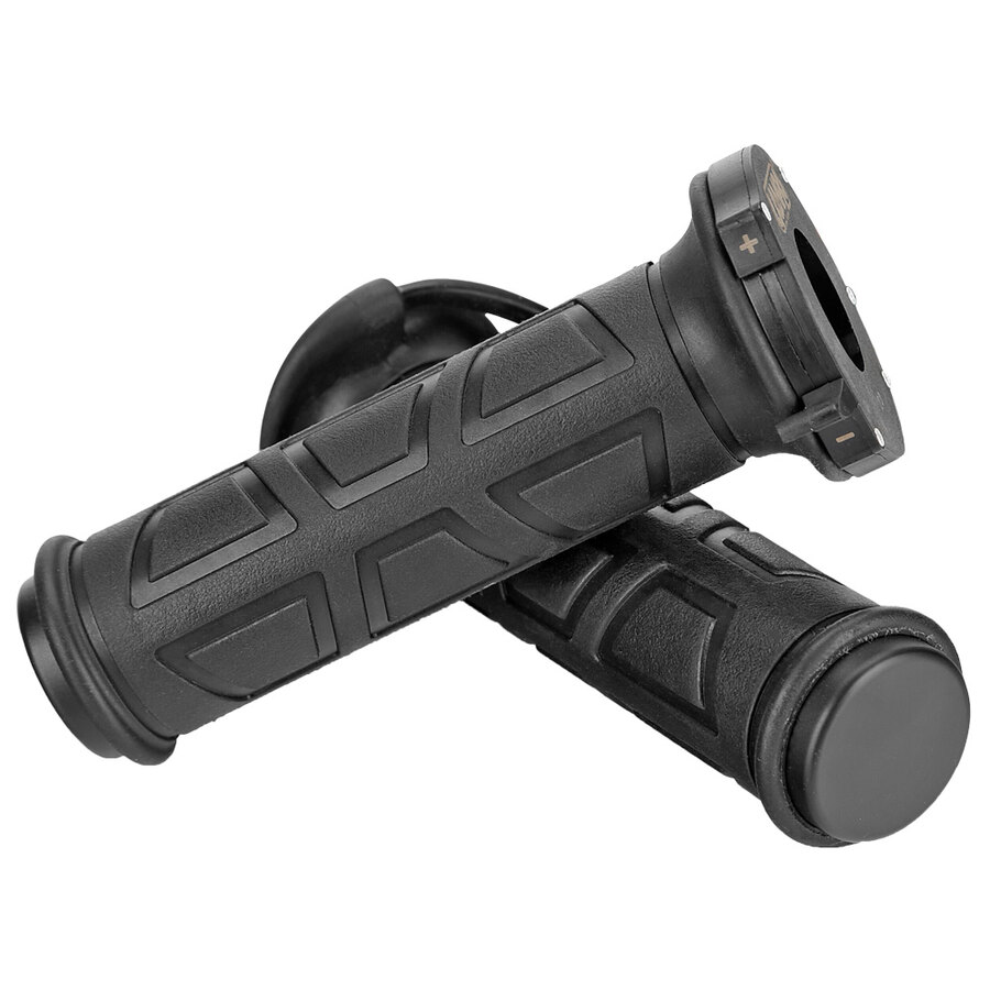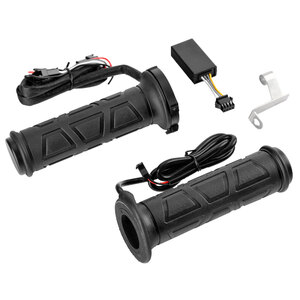 Manopole riscaldate (solo gomma, senza sostituzione comando acceleratore). Adatte anche per comandi elettronici "ride by wire". 4 regolazioni di temperatura con interruttore integrate nella manopola. Centralina esterna separata dalle manopole. Impugnatura in gomma antiscivolo. Dispositivo di protezione contro le inversioni di polarità. Diametro sinistro 22mm, destro 25mm. Alimentazione 12V