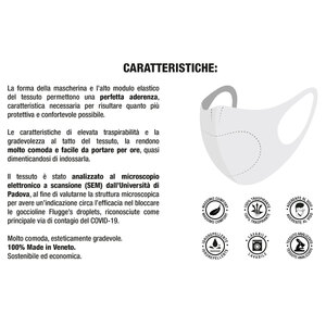 Mascherina filtrante lavabile ad uso esclusivo della collettività. Lavabili in lavatrice con normale detersivo: 90°C per almeno 3 minuti (max 20 volte), 60°C (max 40 volte). Mascherine realizzate in tessuto indemagliabile elastico certificato Oeko-Tex Standard 100. La forma delle mascherine e l'alto modulo elastico del tessuto permettono una perfetta aderenza, caratteristica necessaria per risultare quanto più protettive e confortevoli possibile. Le elevate caratteristiche di traspirabilità del tessuto e la gradevolezza al tatto, le rendono molto comode e facili da portare per ore, quasi dimenticandosi di averle addosso. Non per uso sanitario. Non per uso sui luoghi di lavoro qualora non sia possibile rispettare la distanza minima interpersonale di sicurezza di almeno 1m. Conforme alle indicazioni dell'Art 16 comma 2 del Decreto Legge n.18 del 17/03/2020 e della relativa circolare del Ministero della Salute 0003572-P-18/03/2020. Non sterile, si consiglia lavaggio prima dell'uso