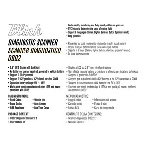 Risparmiate sui costi, monitorando e risolvendo da soli i piccoli problemi. Ricerca DTC per determinare la causa della spie motore. Supporto in 6 lingue (italiano, inglese, tedesco, olandese, spagnolo, francese). Di facile funzionamento. Display a LCD da 2.8" con retroilluminazione. Non richiede nessuna batteria o caricatore, si alimenta con la batteria del veicolo. Supporta il protocollo 9 OBD2. Supporto per auto diesel da 9 a 12V benzina e da 12V successive al 2004. Tensione di funzionamento della batteria: tra 9V e 16V. Funziona con veicoli prodotti dopo il 1996 e con quelli più recenti, conformi alla normativa OBD2. Menù diagnostico: legge i codici, flusso di dati, informazioni sul veicolo, curva in tempo reale, cancella codici, lettura I / M