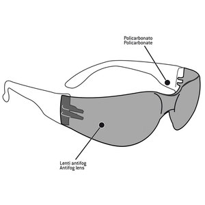 Occhiali antivento con lente antiappannante antiurto 2,2 mm. di spessore in policarbonato. La lente fumè antiappannante è consigliata in condizioni di luminosità media o alta. Sport suggeriti: occhiali da moto, sci, tiro, shooting