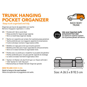 Organizer per baule da appendere con tasche. Mantiene il bagagliaio organizzato e in ordine. Le coperure superiori evitano che la polvere penetri all'interno. Mantiene il bagagliaio organizzato e in ordine. Tasche con coperchio per evitare che la polvere possa penetrare. Tasche profonde per una maggiore capacità di conservazione. Il velcro alla base mantiene l'organizzatore dritto
