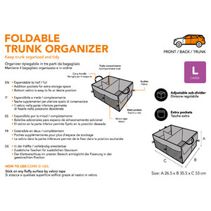 Organizer multifunzionale da bagagliaio. Mantiene il bagagliaio organizzato e in ordine. Tasche supplementari a rete per ulteriore spazio di conservazione. La maniglia per il trasporto lo rende facile da spostare. Il design con fibbia permette di piegarlo piatto quando non in uso. Il velcro nella parte inferiore permette di fissarlo nella posizione desiderata