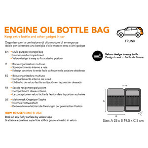 Organizer ideale per contenere una bottiglia d'olio motore di emergenza ed altri gadget. Borsa organizzatore multiuso. Scompartimento interno a rete. Il design con velcro lo rende facile da fissare nella posizione desiderata