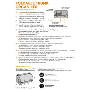Organizer multifunzione da bagagliaio. Mantiene il bagagliaio organizzato e in ordine. Design con velcro facile da fissare. Design pieghevole per risparmiare spazio. Scomparto rimovibile. Il coperchio trasparente evita l'accumulo di polvere e consente di vedere facilmente ciò che viene conservato. La banda elastica presente su entrambi i lati permette di appendere più oggetti. Il velcro inferiore aiuta ad aderire alla superfici in moquette. Il divisorio a scorrimento offre una suddivisione flessibile