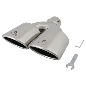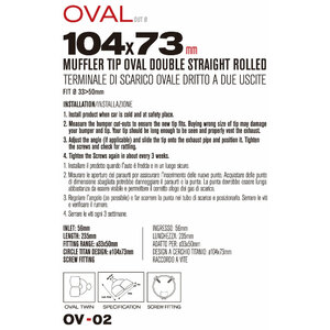 Terminale di scarico ovale dritto a due uscite 104x73mm con bordi arrotondati. Adatto per scarichi con uscita: 33>50mm. Ingresso 56mm. Lunghezza: 235mm Installazione: raccordo a vite. Acciaio inossidabile di alta qualità. Non necessita di saldature e trapanature. Universale: si adatta alla maggior parte delle uscite delle marmitte. Sistema di fissaggio incluso