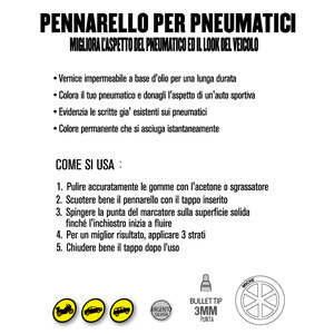 Pennarello per pneumatici. Migliora l'aspetto del pneumatico ed il look del veicolo. Vernice impermeabile a base d'olio per una lunga durata. Colora il tuo pneumatico e donagli l'aspetto di un'auto sportiva. Evidenzia le scritte già esistenti sui pneumatici. Colore permanente che si asciuga istantaneamente. Punta 3mm