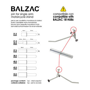 Perno per cavalletto monobraccio Balzac (vedi nostro codice 1814586). Applicazione specifica. Verificare la dimensione del foro del mozzo della propria moto e consultare la tabella applicativa specifica