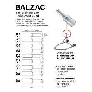 Perno per cavalletto monobraccio (Vedi nostro codice 1558188). Progettato per moto con forcellone monobraccio posteriore. Applicazione specifica. Verificare la dimensione del foro del mozzo della propria moto