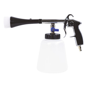 Pistola ad aria. Ugello aria universale. Alimentata da un compressore d'aria, questa pistola consente di pulire a fondo e senza sforzo le plastiche e i tessuti degli interni del veicolo. Questa efficiente pistola per la pulizia può essere utilizzata per: pulizia di tappetini e tappeti; pulizia di cruscotti e altre plastiche, applicazione di prodotti per la pulizia, pulizia di aree inaccessibili, pulizia di tutti i tipi di tessuti interni. Portata d'aria 120 l/min. Maniglia in alluminio lucidato. Capacità del serbatoio di 1lt. Dimensioni: h225mm, lungh. 290mm, largh. 125mm. Peso 0,7kg