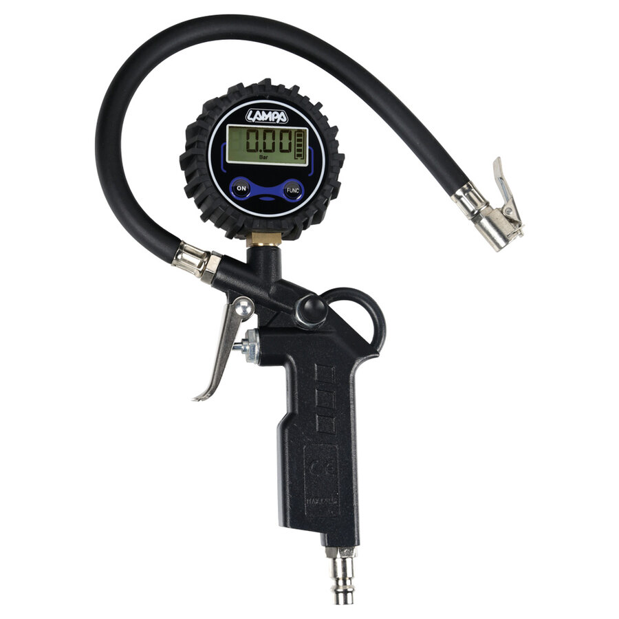 Pistola con manometro digitale per gonfiaggio pneumatici. Serie professionale, per gonfiare/sgonfiare gli pneumatici e misurarne la pressione. Efficienza testata fino a ± 1 PSI di tolleranza per una massima precisione. Manometro con ampio display digitale e schermo LCD retroilluminato per facilitarne la lettura e consentirne l'utilizzo anche durante le ore notturne. Valvola di scarico per far defluire l'aria in caso di eccessiva pressione dello pneumatico. Spegnimento manuale o automatico dopo circa 3" di inattività. Robusta struttura in metallo. Manometro con guscio protettivo in gomma resistente agli urti. Il tubo flessibile in gomma da 30cm con testina di accoppiamento rapido consente di raggiungere e operare con facilità anche sulle valvole situate nelle posizioni più scomode o lontane. 4 differenti scale di misura con i relativi intervalli: 0~170 PSI, 0~12 Bar, 0~1200 KPa, 0~12 Kgf/cm². Batterie per il funzionamento non incluse. Innesto aria con attacco rapido da 1/4"