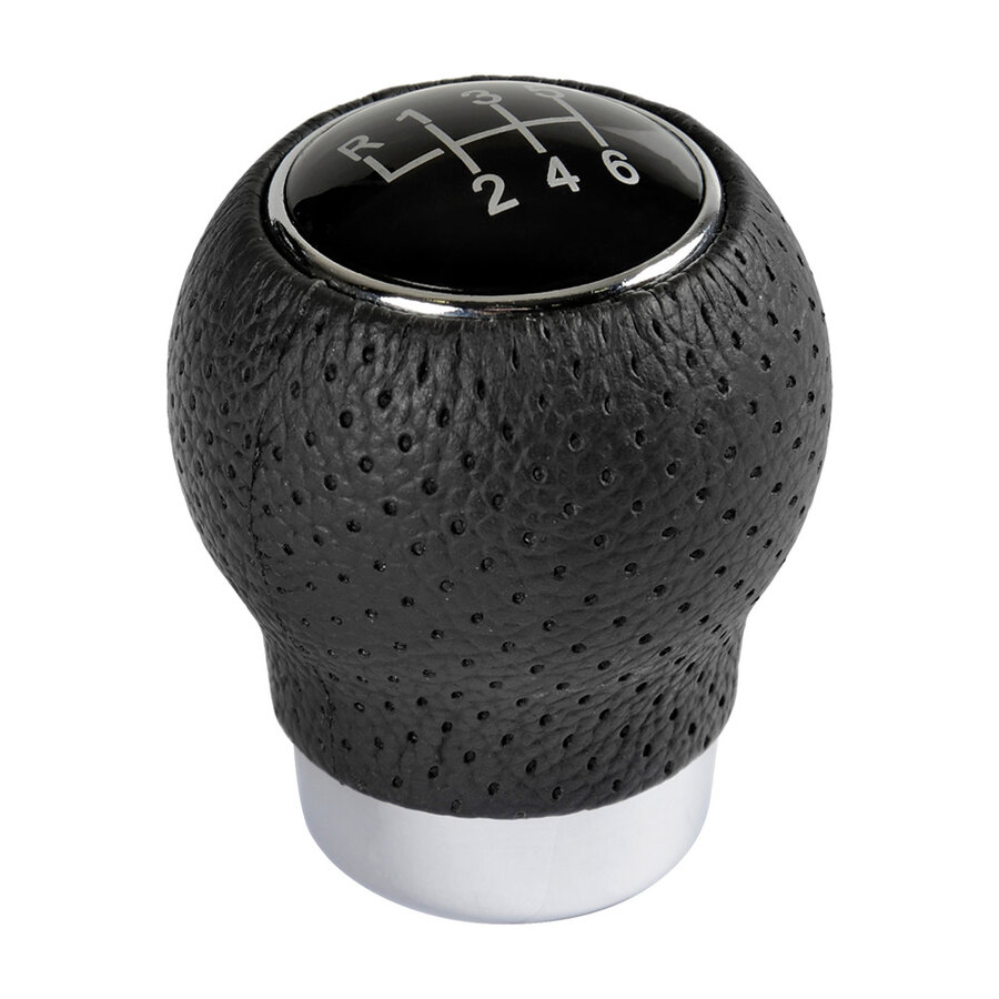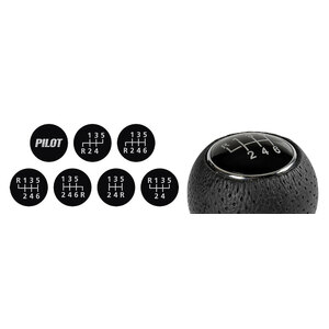 Pomello leva cambio. Pelle nera con cuciture nere e alluminio cromato. Pomello leva cambio alluminio e pelle. 7 emblemi intercambiabili. Montaggio fai da te tramite kit con adattatori e chiave esagonale in dotazione. Attacco brevettato universale idoneo per leve cambio standard (diam. 15 mm max) e leve cambio speciali con ghiera di innesto retromarcia (diam 32 mm max)
