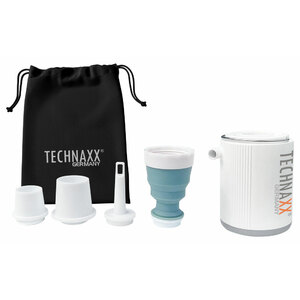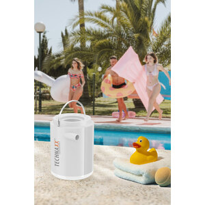 Mini pompa ad aria a batteria. Pompa ad aria. Batteria a lunga durata 1360mAh. Leggero e facile da trasportare. Luce da campeggio a LED. Con 5 adattatori. Con borsa. Velocità/pressione di gonfiaggio 180 l/min /3,5 kPa (massimo). Energia 13,5 W. Batteria 1360 mAh /3,7 V. In carica ingresso CC 5 V/0,8 A (porta USB tipo C). Tempo di ricarica ca. 1,5 ore. Tempo di esecuzione Fino a 15 minuti di gonfiaggio o 5 ore di luce LED. LED 40/200/400 Lumen.