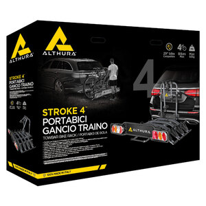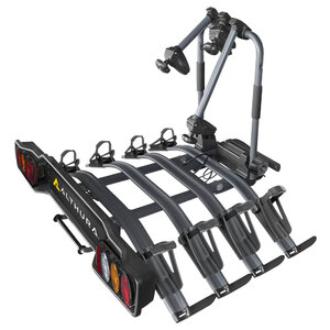 Portabici da gancio traino per 4 bici (carico massimo per bici 15kg, portata max portabici 60 kg). Dotato di un sistema di aggancio e sgancio estremamente compatto e funzionale con sistema antifurto tra portabici e auto. Si inclina mediante l'uso di un pedale per facilitare il carico posteriore. Braccetti distanziatori inclusi. Dim. max telaio bici (per aggancio braccetto): 60mm. Verniciatura antigraffio. Completo di barra ripetitrice con fanali 13 poli omologati secondo direttiva europea. Binari in alluminio. Compatibile con bici fino a 29" con interasse massimo 1250 mm. Larghezza massima ruote 70 mm. Omologato secondo direttiva europea. Acquistabili separatamente: pomello con chiave per la chiusura delle bici al portabici (vedi nostro codice 1818128); rampa di carico per biciclette (vedi nostro codice 1585274).