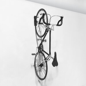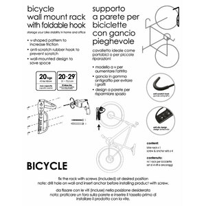 Supporto a parete per biciclette con gancio pieghevole. Cavalletto ideale come portabici o per piccole riparazioni. Modello a "V" per aumentare il grip. Design "a parete" per risparmiare spazio. Gancio rivestito in gomma antigraffio per evitare di graffiare la bici. Max load 20kg. Adatto per biciclettecon pneumatici da 51 a 73,5cm (20-29")