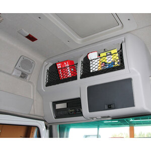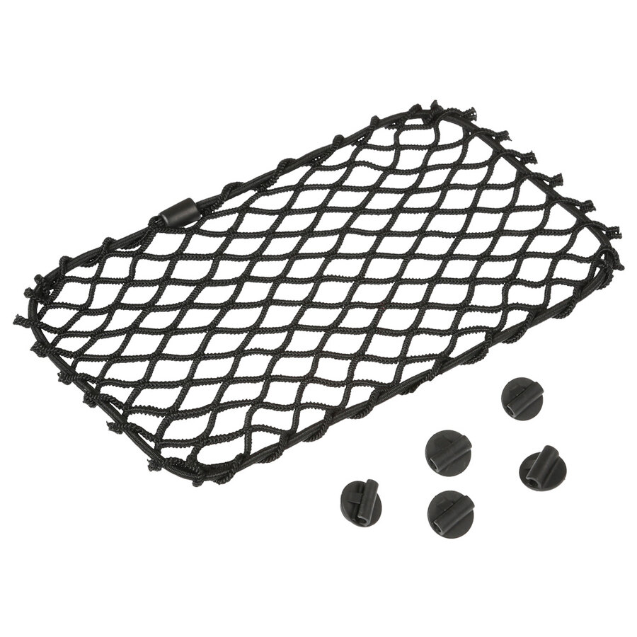 Tasca a rete elasticizzata. Fissaggio originale a bottone. Universale per applicazioni sulla console centrale, portiera, sedile. Multiuso, per auto, camion, camper, imbarcazioni. Kit fai da te, completo di bottoni di fissaggio e dima per i fori