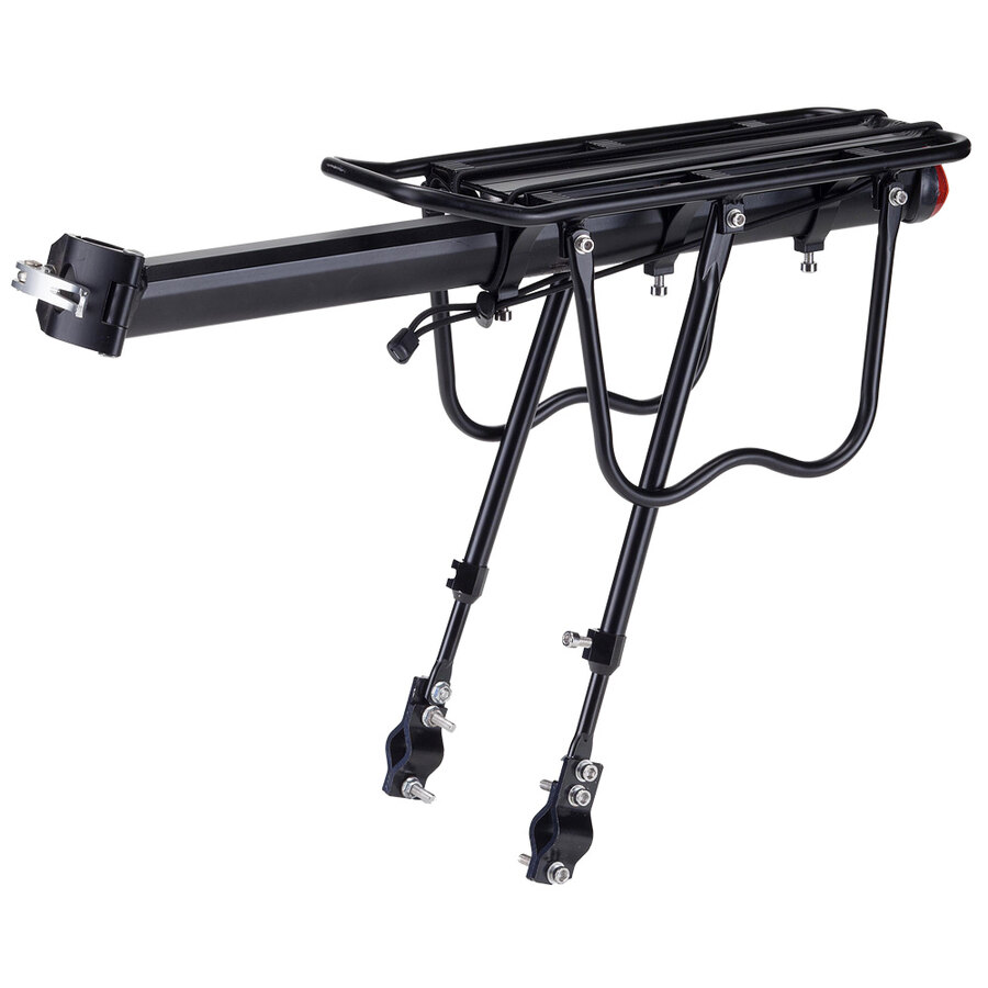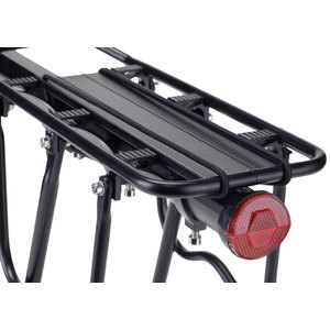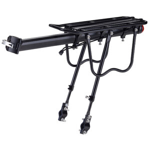 Pratico portapacchi posteriore al reggisella in alluminio con piano di carico scorrevole, aste regolabili e smontabili per adattarsi a varie tipologie e dimensioni del telaio della bici. Nella parte posteriore è presente un catarifrangente rotondo. Nella zona di carico è presente un elastico per fissare il materiale. E' adatto a reggisella con diametro da 25.0 a 31.8 mm. Peso netto del prodotto 1.05 kg. Portata 50 kg