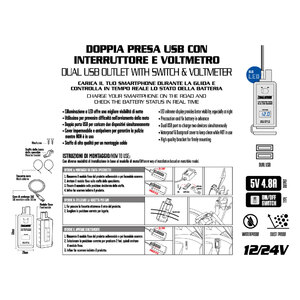 Doppia presa USB con interruttore e voltmetro. Carica il tuo smartphone durante la guida e controlla in tempo reale lo stato della batteria. Output 5V 4.8A. L'illuminazione a LED offre una migliore visibilità di notte. Utilissimo per prevenire difficoltà nell'avviamento della moto. Doppia porta USB per caricare due dispositivi simultaneamente. Cover impermeabile e antipolvere per garantire la pulizia mentre non è in uso. Staffa di alta qualità per un montaggio saldo