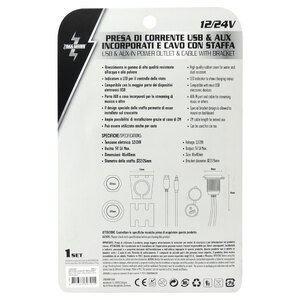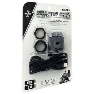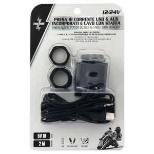 Presa di corrente USB & AUX. Include cavo e staffa di montaggio. Carica il tuo smartphone in qualsiasi momento. Rivestimento in gomma di alta qualità resistente all'acqua e alla polvere. Indicatore a LED. Compatibile con la maggior parte dei dispositivi elettronici USB. Molte possibilità di installazione grazie al cavo di 2M Può essere utilizzato anche per auto. Uscita 5V 1A Max Dimensioni 46x40mm