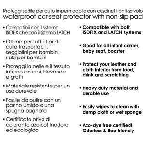 Proteggi sedile per auto con tasca organizer. Super aderenza. La schiuma ad alta densità previene avvallamenti e graffi al sedile dell'auto. Il rivestimento in pelle PVC garantisce una protezione extra contro i danni dovuti alla compressione. La tecnologia super aderente mantiene il seggiolino sempre in posizione. Dotato di fessure laterali profonde compatibili sia con il sistema ISOFIX che con il sistema LATCH. Funzione 2 in 1: lasciare il pannello aperto per i seggiolini rivolti nella direzione di marcia, ripiegare il pannello per i seggiolini rivolti nella direzione opposta a quella di marcia. Le dimensioni offrono una copertura completa, ottima per tutti i tipi di seggiolini per bambini, rialzi e culle da viaggio. Comoda tasca organizer per custodire giocattoli, bicchieri, bottiglie, ecc