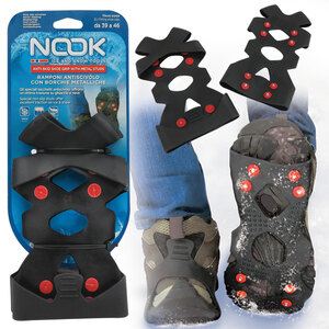 Ramponi antiscivolo con borchie metalliche. Gli speciali tacchetti antiscivolo offrono un'ottima trazione su ghiaccio e neve. La soluzione migliore e più sicura per evitare di scivolare. Perfetti anche per camminate, trekking, arrampicate leggere, la pesca sul ghiaccio e varie attività all'aperto sia d'inverno che d'estate. I perni metallici di presa a terra offrono un'eccellente trazione su ghiaccio e neve. Altamente elastico per allungarsi e adattarsi a vari tipi di stivali/scarpe. I tacchetti impediscono di scivolare su ghiaccio, neve, fango, erba bagnata o altre cattive condizioni. Si indossano in pochi secondi. Struttura leggera, facile da piegare su se stessa e portare in tasca. Utili tutto l'anno. Realizzati con ramponi resistenti all'abrasione e gomma di alta qualità
