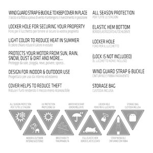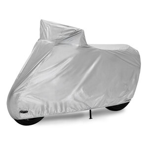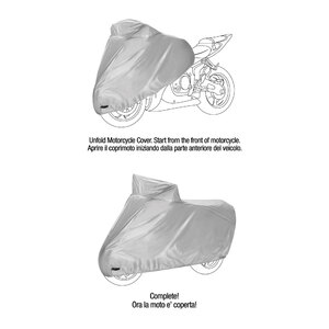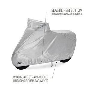 Coprimoto per tutte le stagioni. Ultra leggero con trattamento resistente all'acqua. Custodia inclusa. Bordo elasticizzato. Cinturino con fibbia. Foro per il lucchetto (lucchetto non incluso). Per uso da interno ed esterno. UV protection. Traspirante. In tessuto idrorepellente (att.ne: il veicolo si può bagnare se rimane esposto per un lungo periodo di tempo sotto la pioggia, nel bagnato o sulla neve). Il colore chiaro riduce il calore in estate. Protegge da sole, pioggia, neve, polvere, sporco.... Disponibile misura per ATV - Quad (vedi nostro codice 1636647). Disponibile anche la versione presagomata "Regular Top" per veicoli equipaggiati con parabrezza e bauletto (vedi nostro codice 1636648, 1636649 e 1636650)